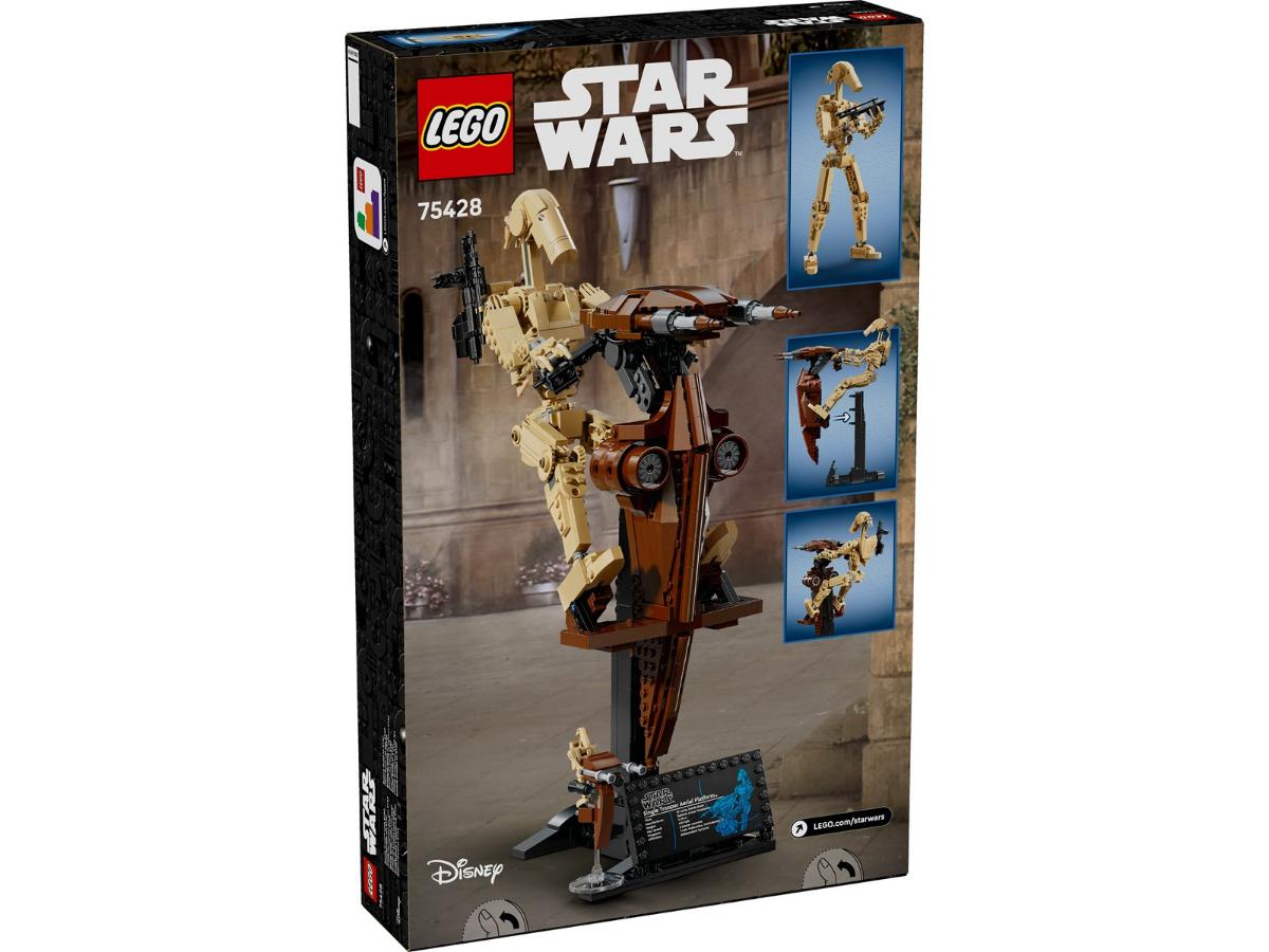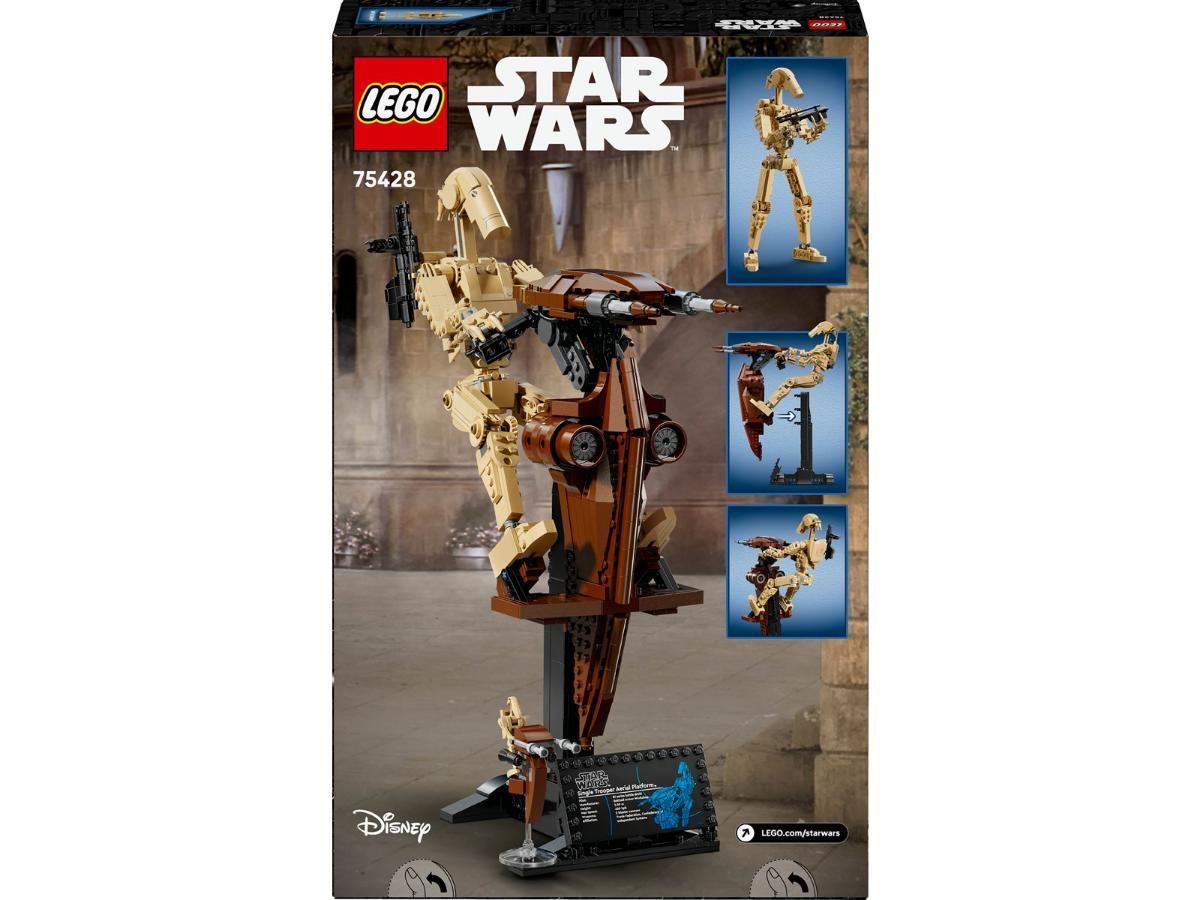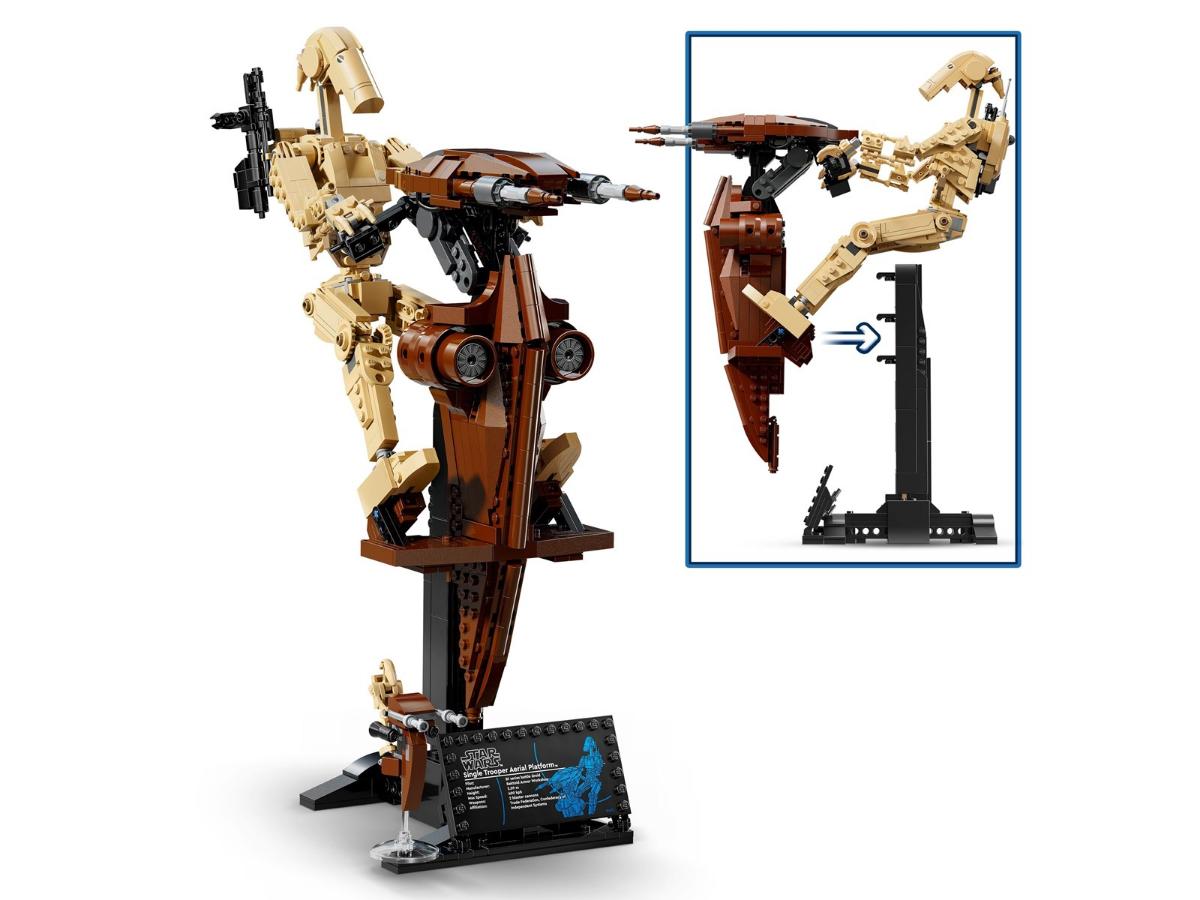 W zestawie LEGO Droid bojowy z platformą STAP znajdziesz detalicznie wykonany model droida bojowego oraz śmigacza STAP. Całość można ustawić na podstawce lub odczepić droida, aby bawić się nim w różnych scenariuszach. Dodatkowo, możesz zmieniać ekspozycję, ustawiając droida z blasterem obok pojazdu oraz prezentując figurkę LEGO z tabliczką z napisem. To doskonała okazja, aby stworzyć epicką dekorację, która przyciągnie wzrok każdego fana.