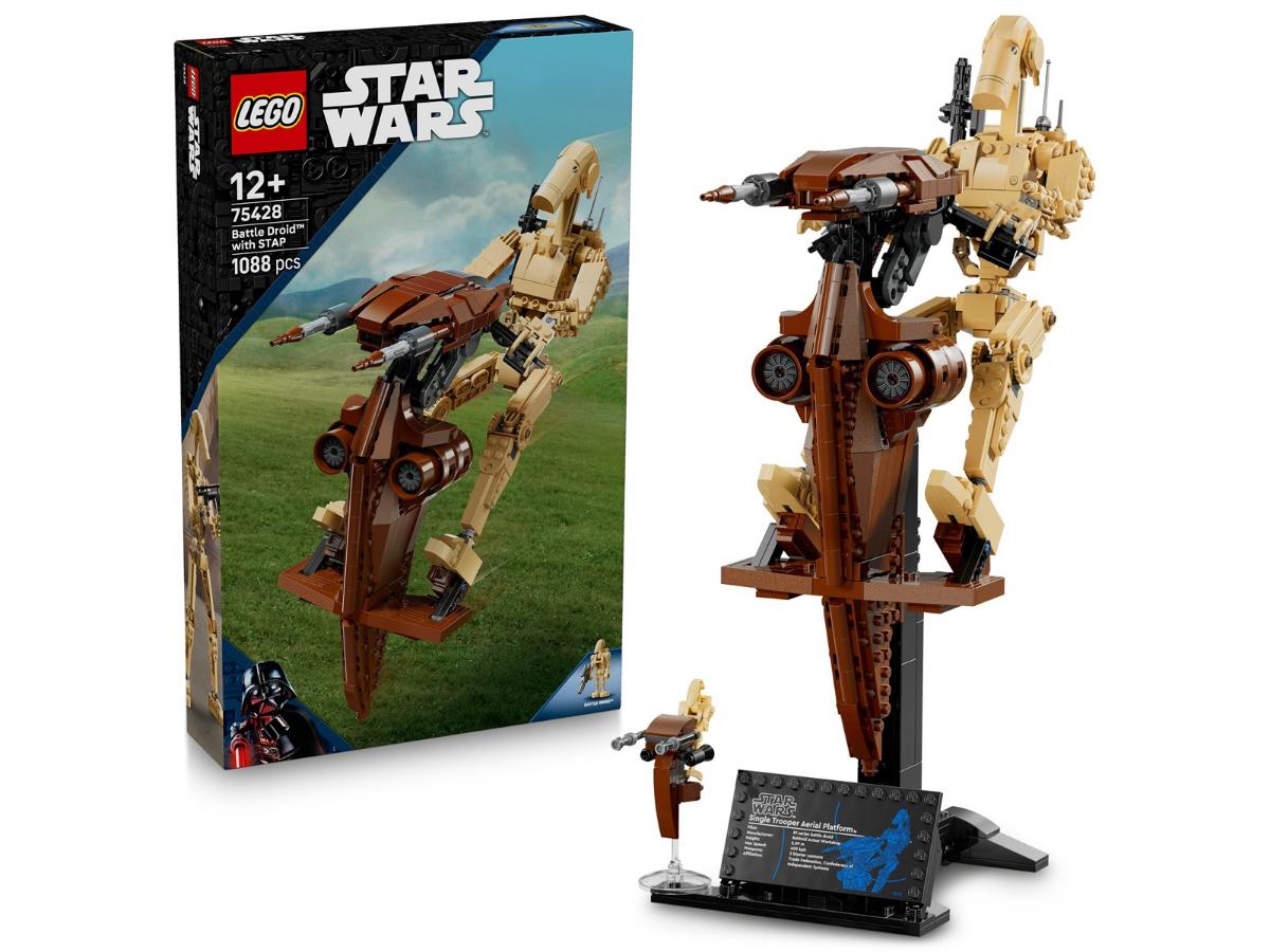 LEGO Droid bojowy z platformą STAP to zestaw składający się z 1088 elementów, wykonany z wysokiej jakości plastiku. Wymiary zestawu po złożeniu to 140 x 300 x 380 mm, co czyni go idealnym do eksponowania na półce. Zestaw jest rekomendowany dla dzieci od 12 roku życia, ale będzie cieszył również dorosłych kolekcjonerów.